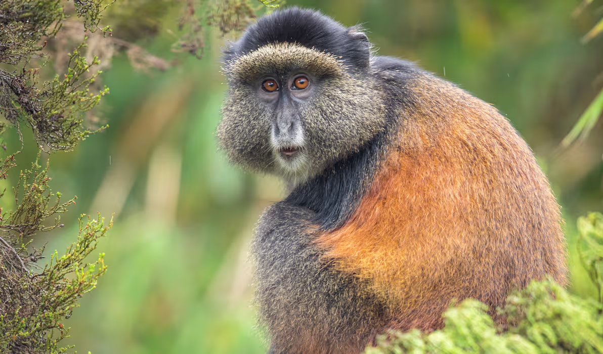 Gishwati National Park is home to a remarkable variety of wildlife. Visitors can expect to encounter chimpanzees, one of the park’s most iconic inhabitants, alongside golden monkeys, duikers, and other small primates. Over 200 bird species thrive in the forest, making the park an excellent destination for Rwanda birding safaris. Endemic and migratory birds alike add color and vitality to the rainforest canopy. Scenic trails wind through the forest, leading to waterfalls, bamboo groves, and streams. Unique vegetation, including towering mahogany, fig, and bamboo species, contributes to the park’s lush and tranquil environment. Additionally, the surrounding hills and valleys offer stunning panoramic views, enhancing the sense of immersion in Rwanda’s natural landscapes.